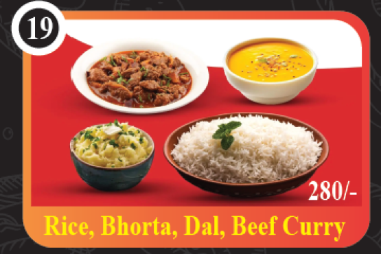 Rice, Bhorta, Dal, Beef Curry